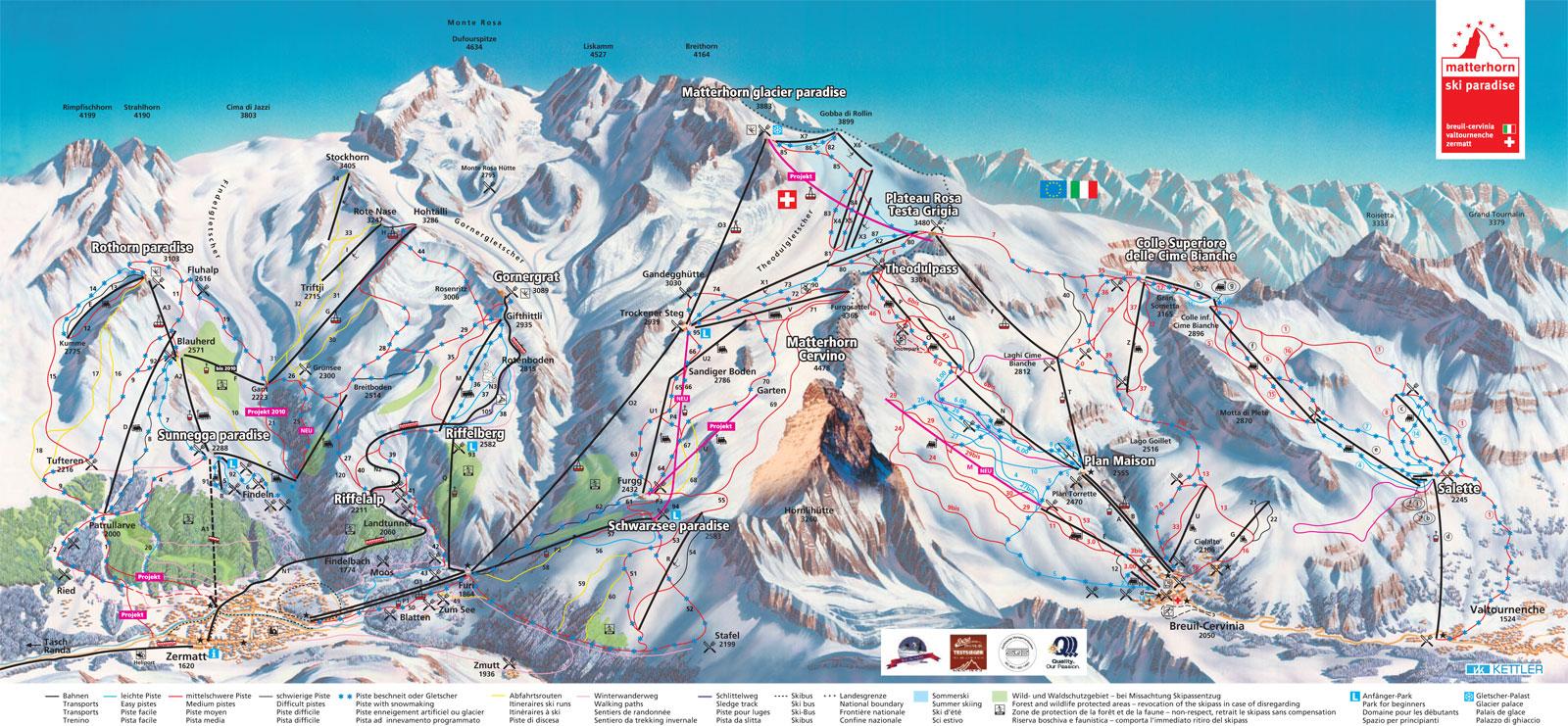 - Domaine skiable étendu L’immense domaine offre environ 360 km de pistes interconnectées entre la Suisse et l’Italie (stations de Cervinia et Valtournenche), adaptées à tous les niveaux de compétence.
